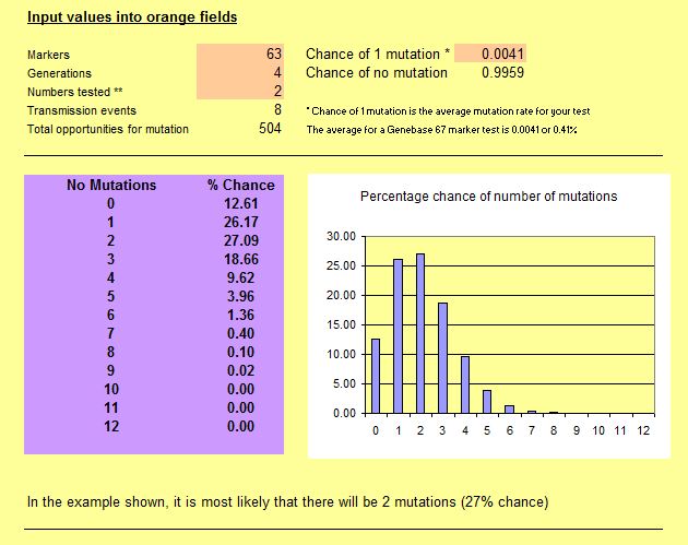 The Calculator shows the most likely number of mutations for any given set of markers, generation gap and average mutation rate. The formula uses a standard probability mechanism, which looks more complicated than it actually is :