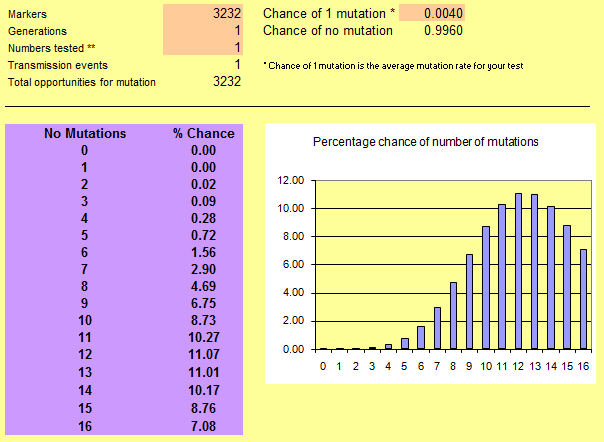 We can also use our calculator to see how likely 16 mutations actually is, over 3232 transmission events. Note that when using the calculation for more than 2 people, enter ‘markers’ as transmission value, and ‘generations’ & ‘numbers tested’ as ‘1’ . This then forces the value for ‘Total opportunities for mutations’ to be the transmission event value. This creates in effect the throwing of the dice 3232 times and calculating how many times a mutation event is likely to occur.
