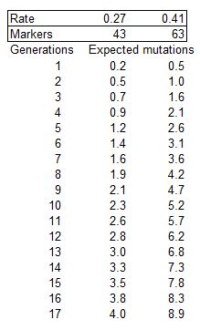 We can use this formula to create a table of expected mutations in both the 44 and 67 marker tests. Note that the number of markers used in the calculations are actually 43 and 63, and not 44 and 67, as certain markers have several values so it is not certain where the mutation occurred, or indeed if it occurred, and it is standard practice to exclude these from calculations.
