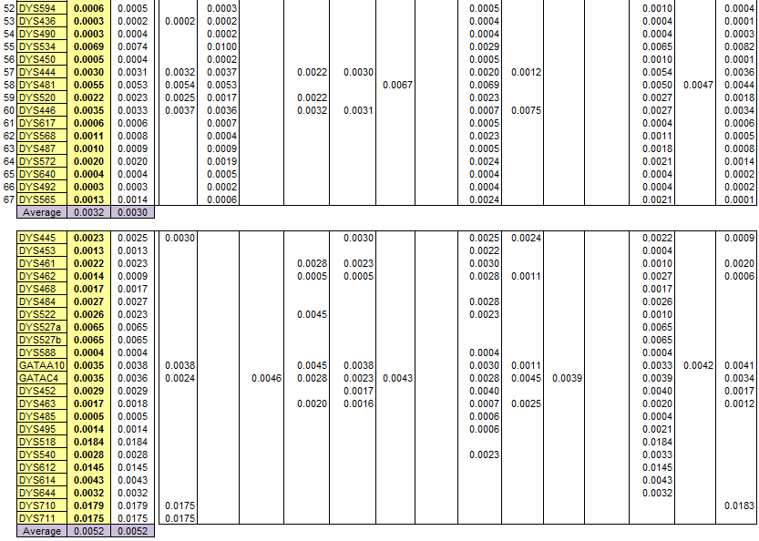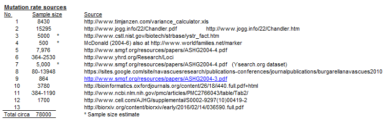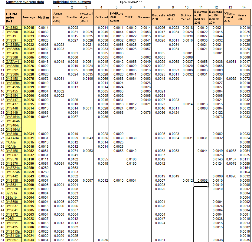 As part of our research, we have compiled a database of mutation rates of Y-STR markers using results from many studies. Please feel free to use the below for your information, or email if you would like the spreadsheet. If you find it useful or have any comments we would welcome an email to admin@hawgoodfamily.co.uk