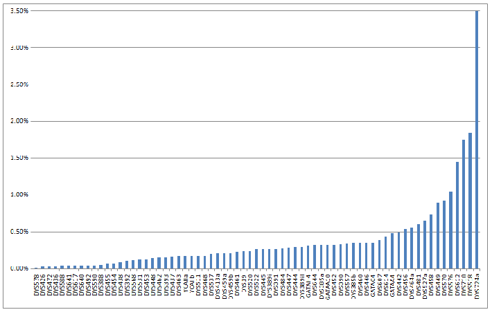 Most markers have a low mutation rate but some are far faster, as can be seen below. The left hand scale is the likely mutation rate per generation